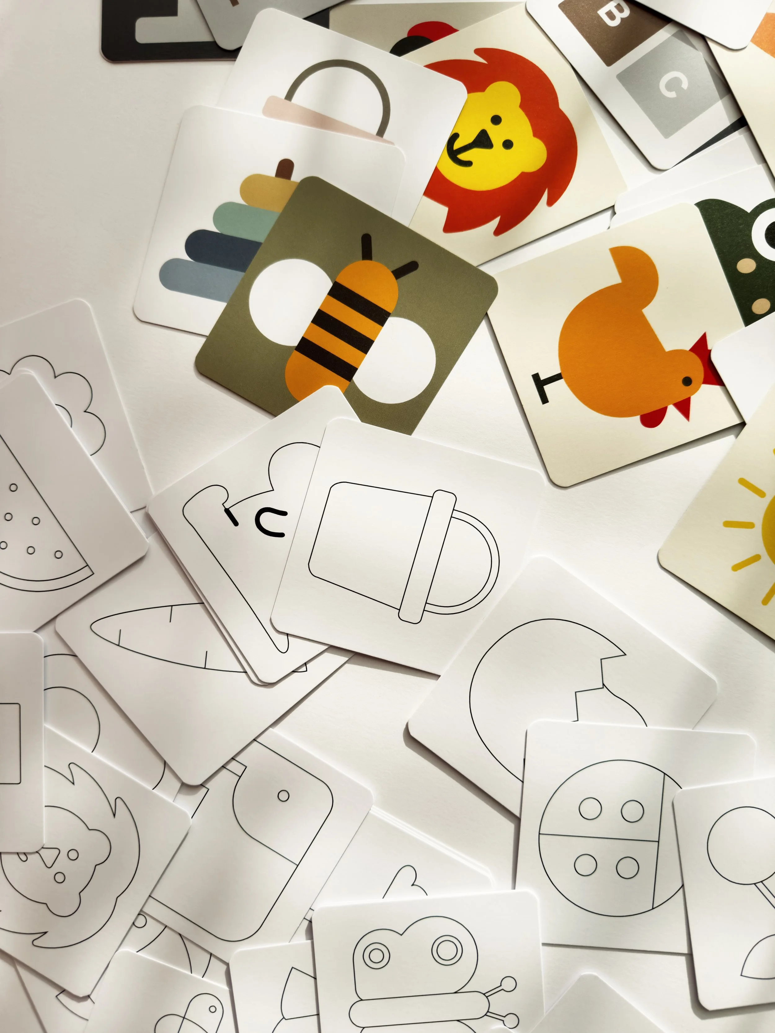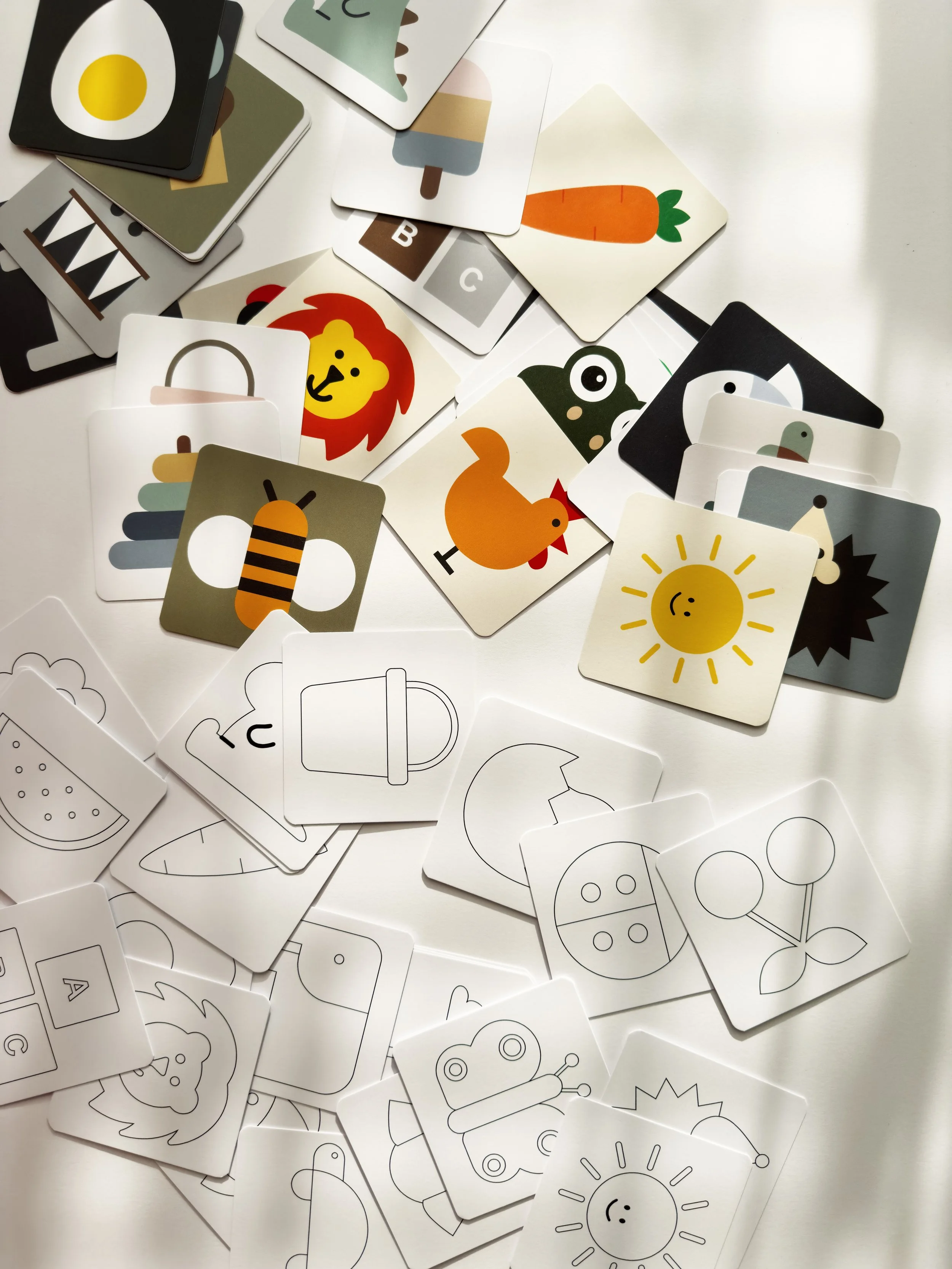 Počet kusov: 60 obojstranne potlačených farebných (30) a čierno-bielych (30) kariet zvieratiek, predmetov, ovocia