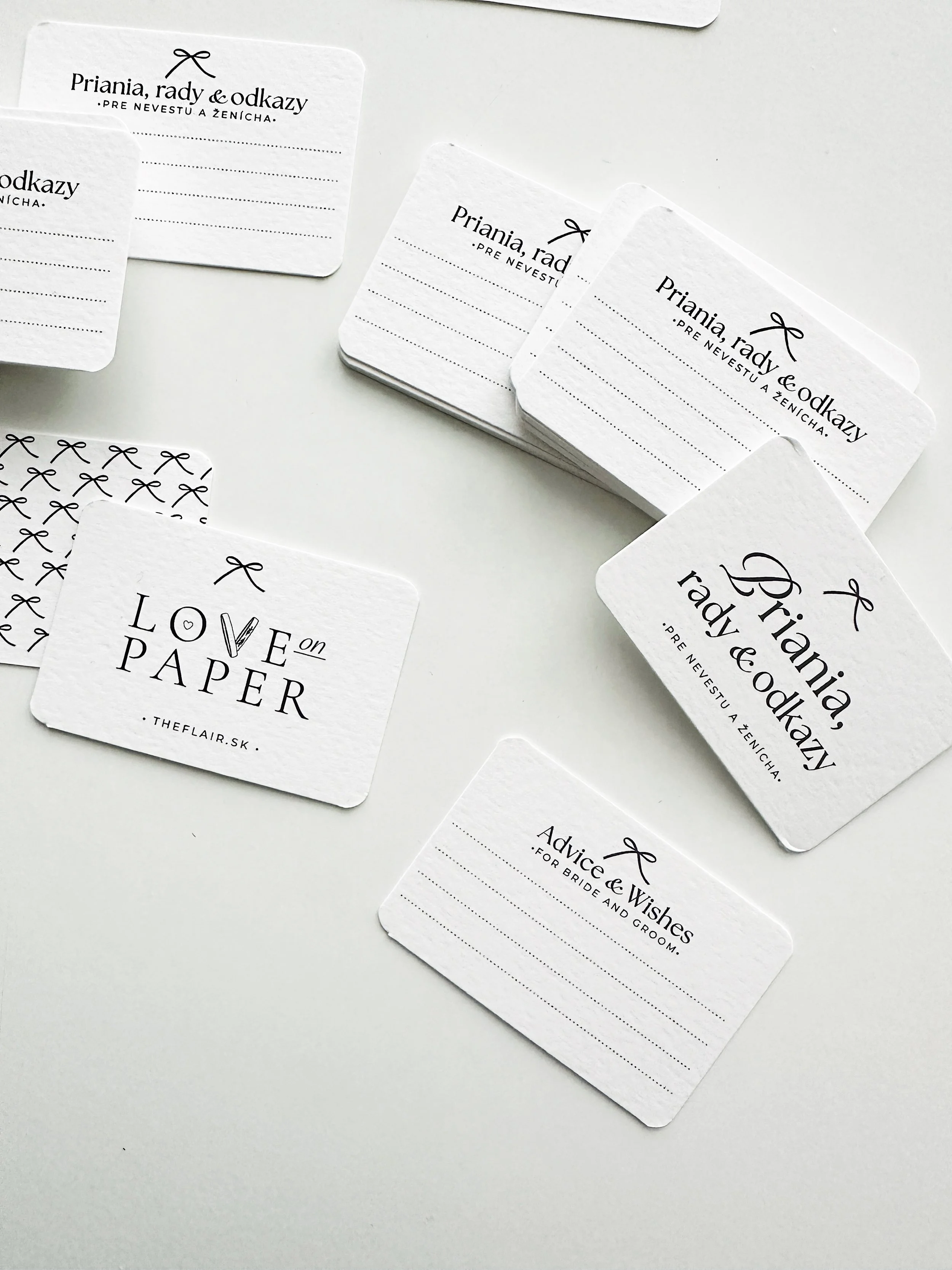 Ak si chcete zachovať pekné spomienky na Vašu svadbu nielen na fotografiách, môžete si vybrať práve naše kartičky, na ktoré Vám svadobní hostia napíšu priania, rady do spoločného života alebo len odkaz na pamiatku Vášho svadobného dňa a vhodia do svadobnej krabičky.